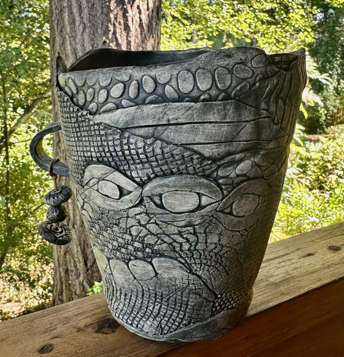 My hand-built layered bowls and vessels are inspired by the shapes and textures of a riverbed, one of my favorite places to be. Meandering mossy paths, rocky beaches and the cut banks of sediments from long ago are embedded into each piece. These vessels are connected to the flow of clay and water, and just like a rocky riverbed, they ground me and bring me peace.